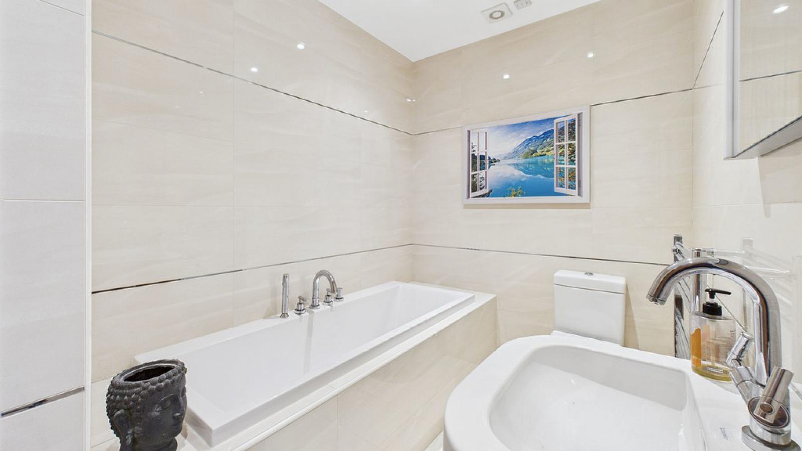 BATHROOM Suite comprising panelled bath; vanity sink unit; dual flush WC; heated towel rail; tile floor; built-in airing cupboard.