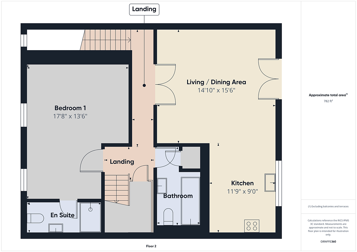 The first floor comprises a bright living and dining area with a Juliet balcony, open plan to a modern kitchen featuring integrated appliances. This floor also includes a luxury bathroom, a bedroom, and an en suite shower room.