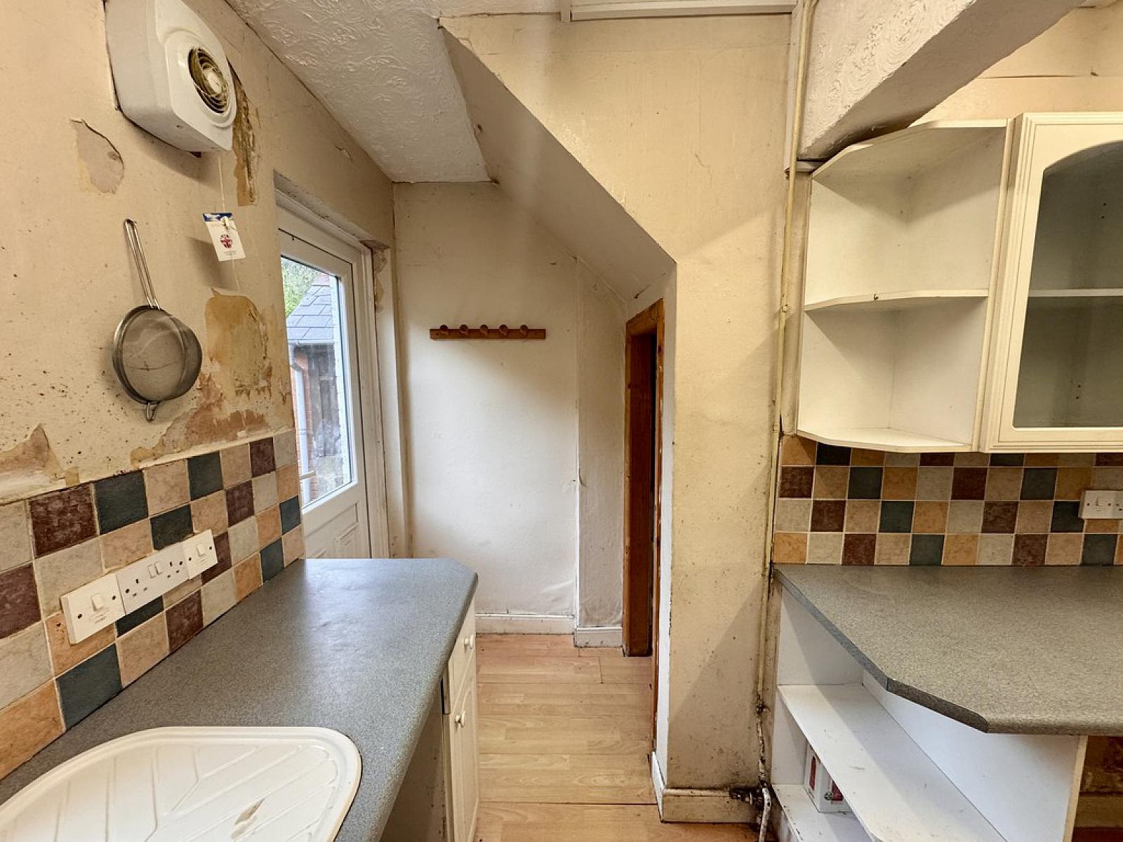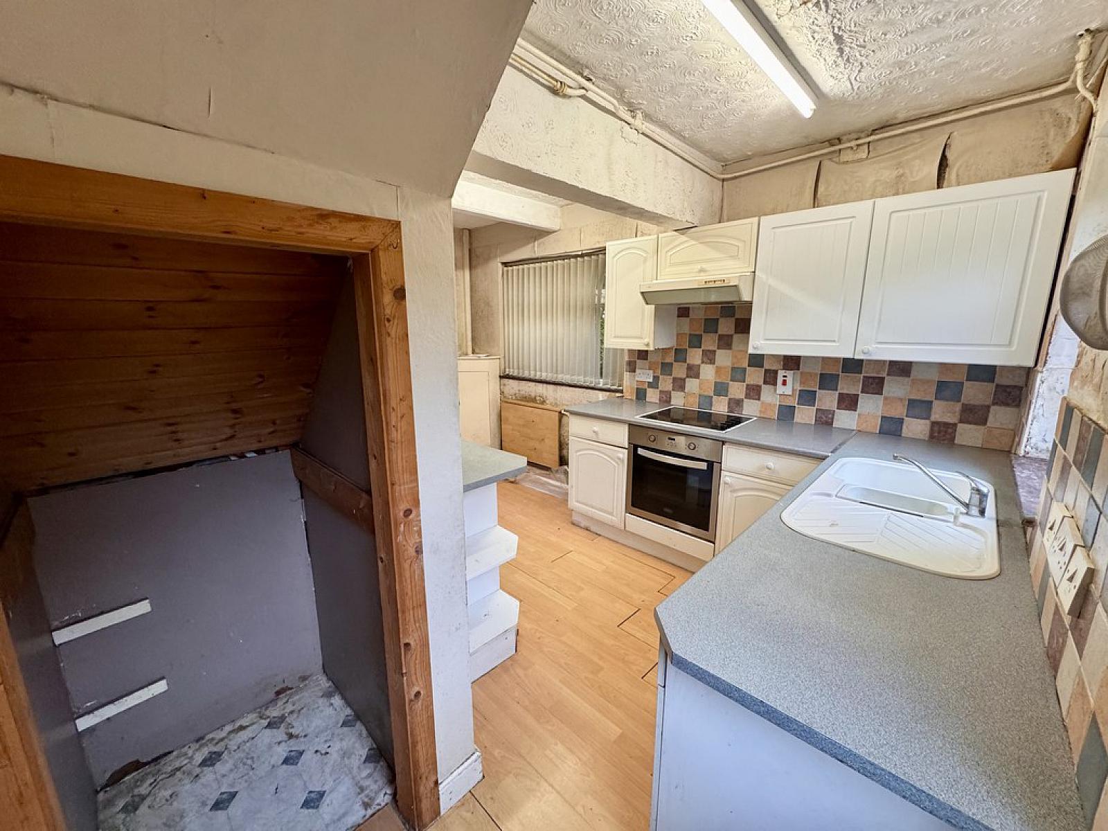 KITCHEN 13' 7" x 10' 7" (4.149m x 3.242m) Range of high and low level units, Single drainer sink unit, integrated hob, stainless steel underoven, extractor fan, glazed display cabinet, breakfast bar, understairs storage cupboard, door to rear yard.