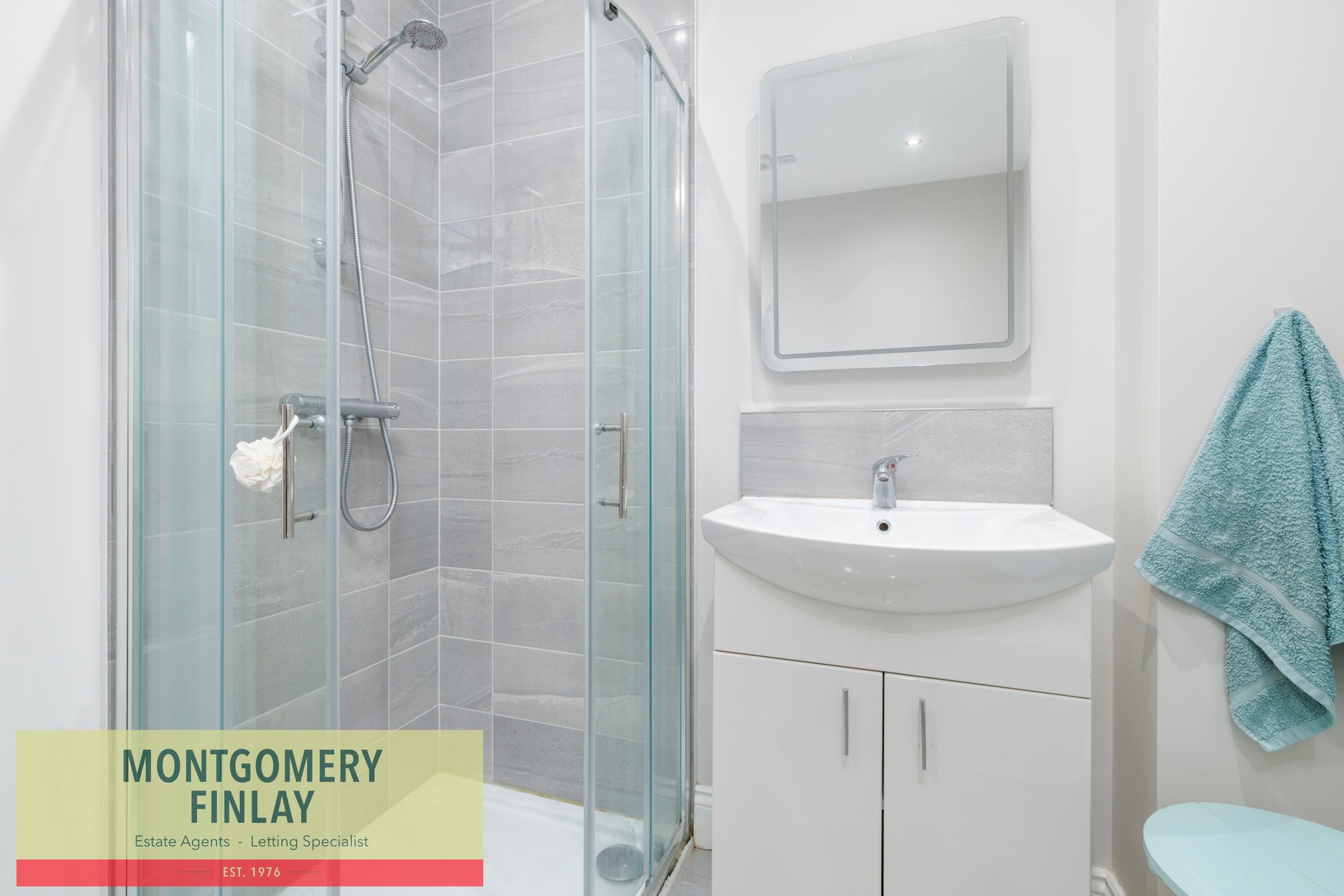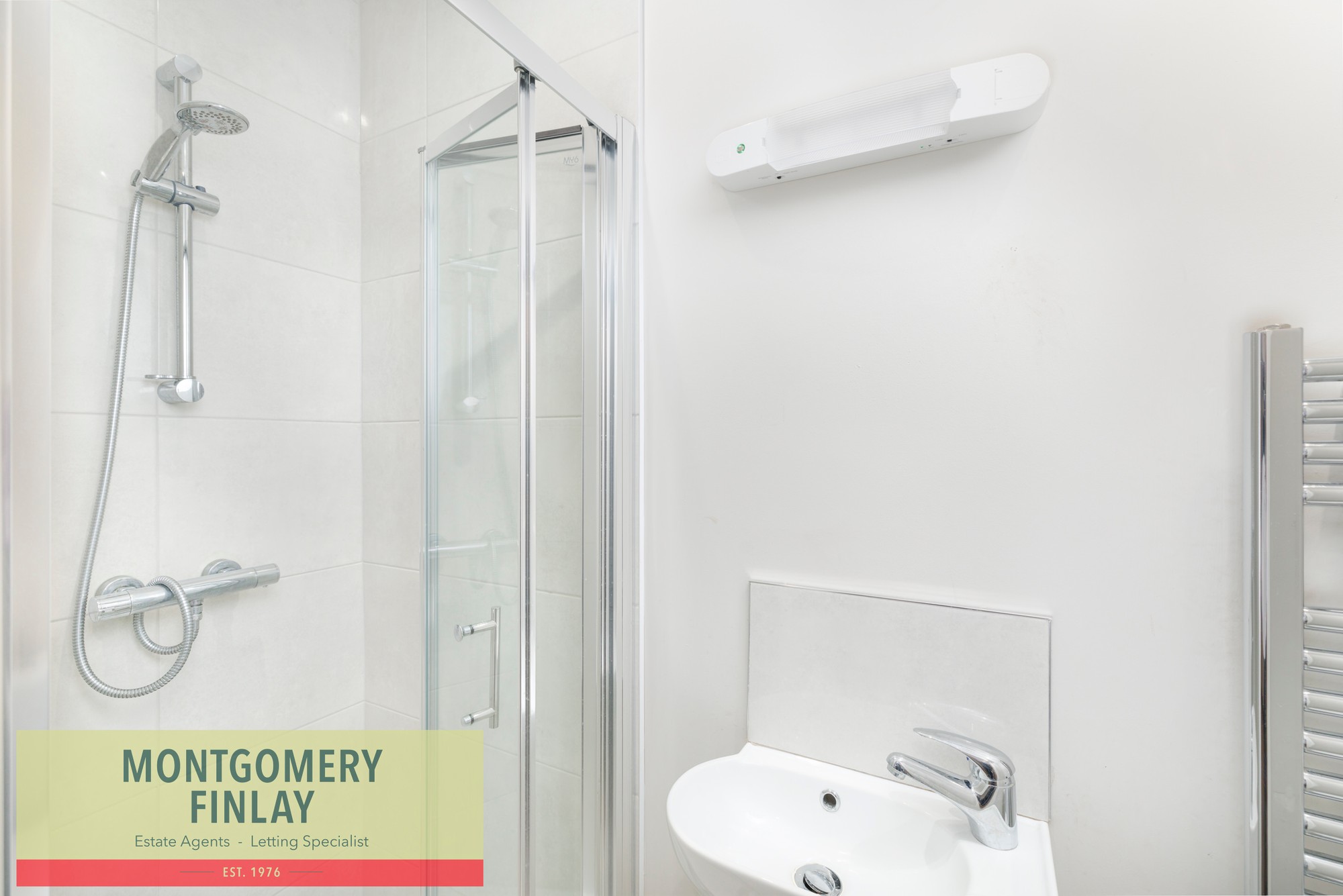 • W.C., wash hand basin, heated towel rail and tiled floor