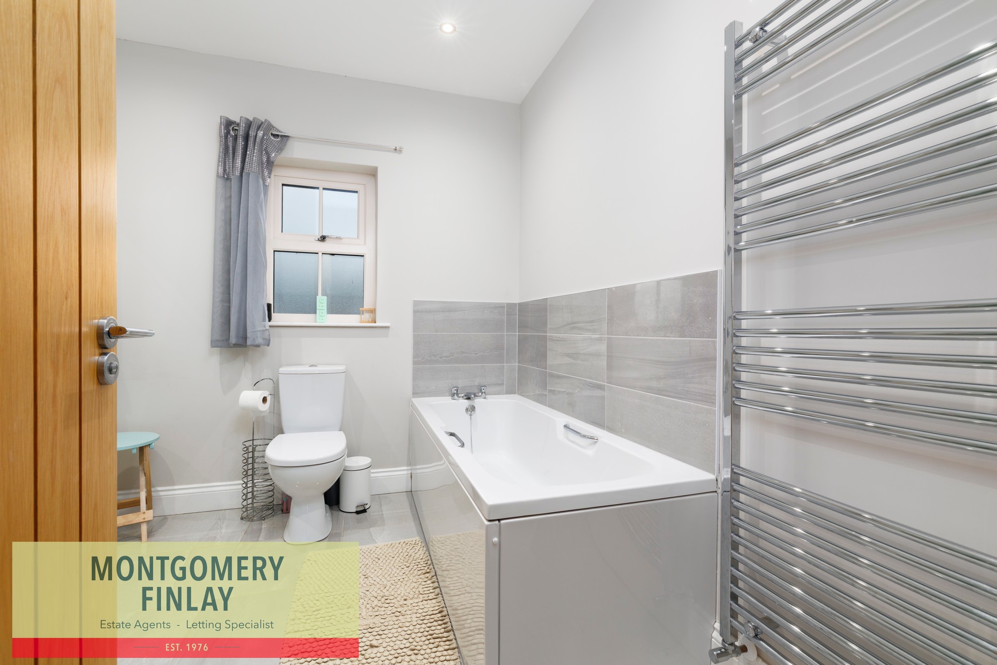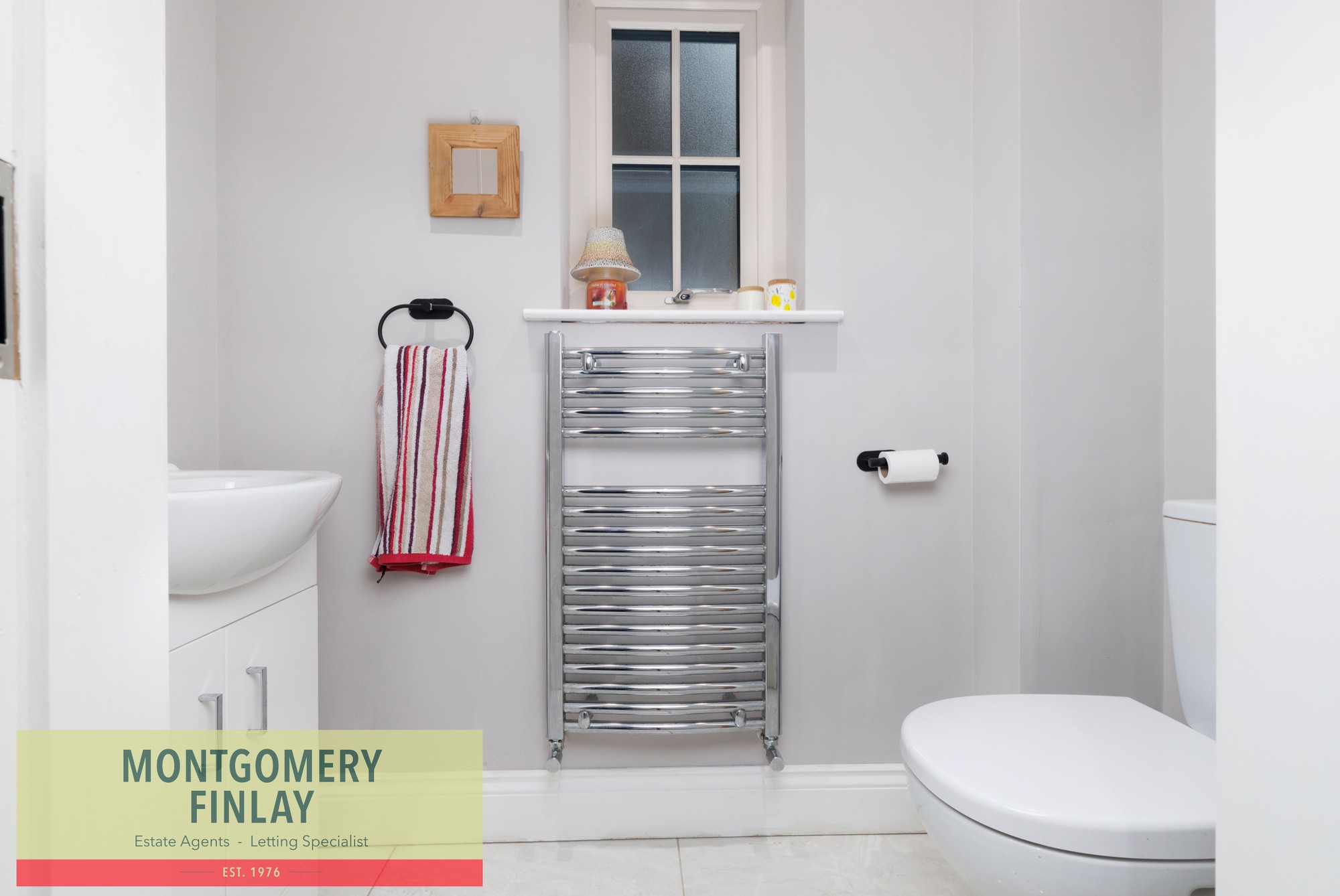 • Vanity unit, W.C., heated towel rail, and tiled floor