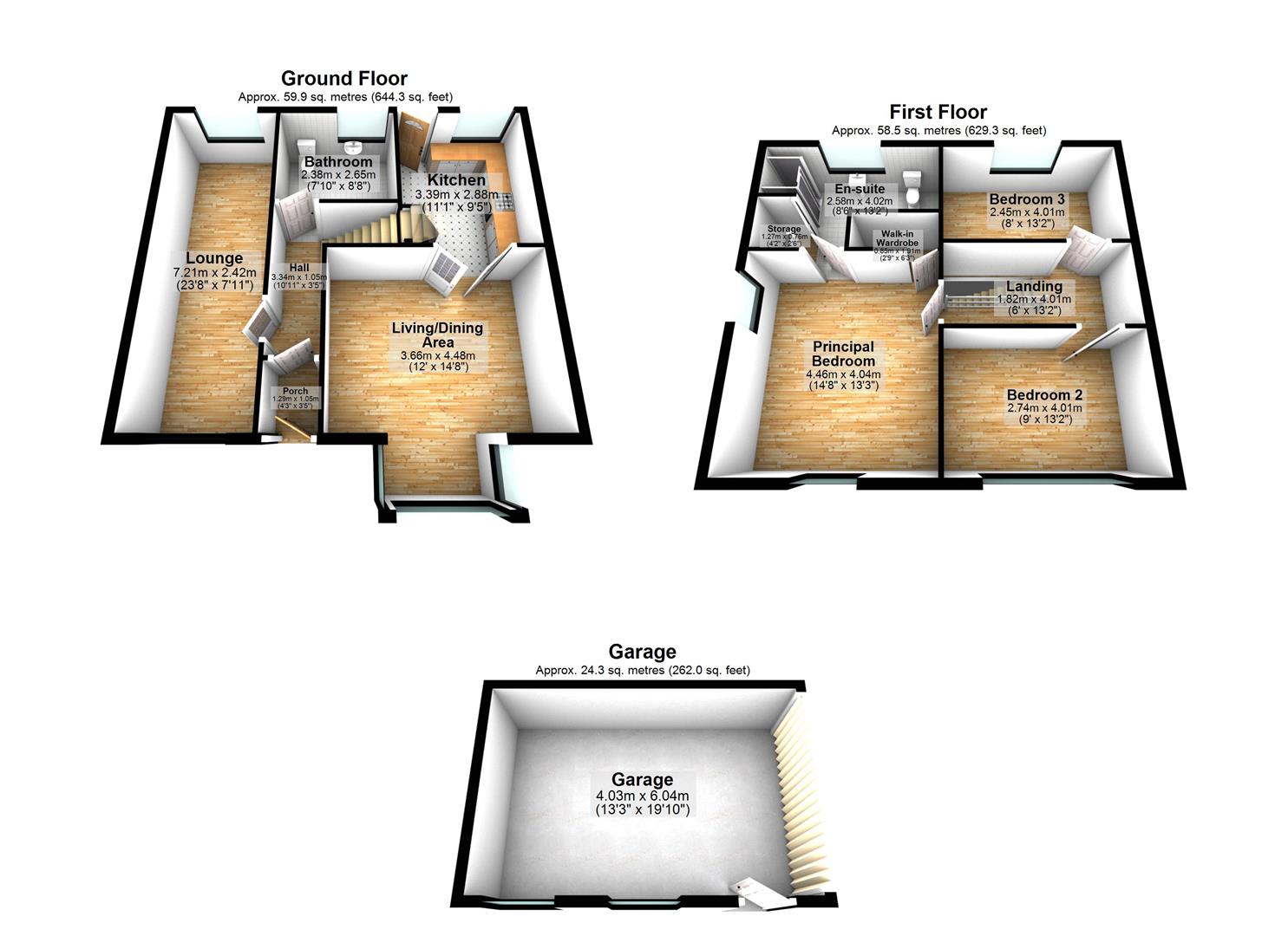 On the first floor, there are three generous bedrooms, including a principal bedroom with ensuite shower room and wardrobe.