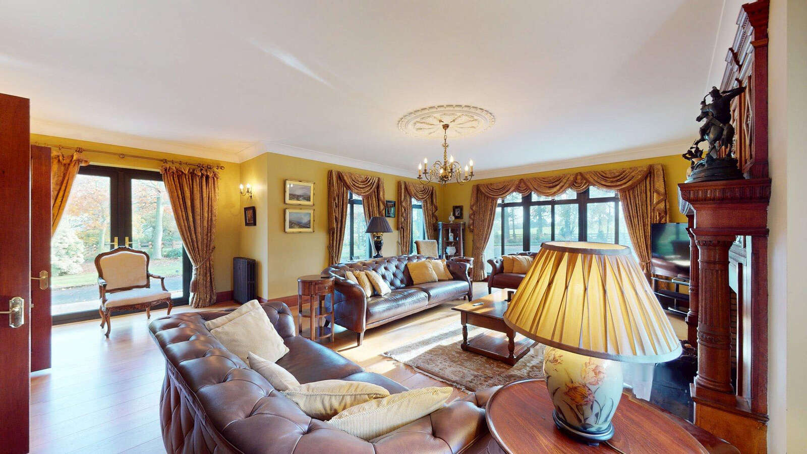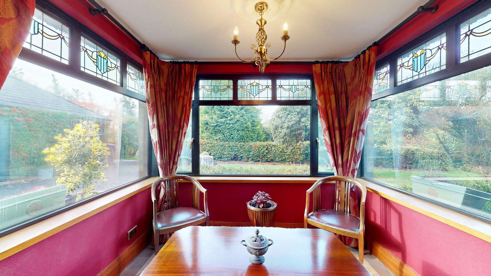 15'10 x 12'6 Antique cast iron fireplace with open fire, granite hearth and ornate handcarved Oak surround. Ceiling cornicing with ornate centre piece. Original Red American oak floor. Bay window enjoying superb views over landscaped gardens and surrounding countryside. Opening leading into Sun Lounge.