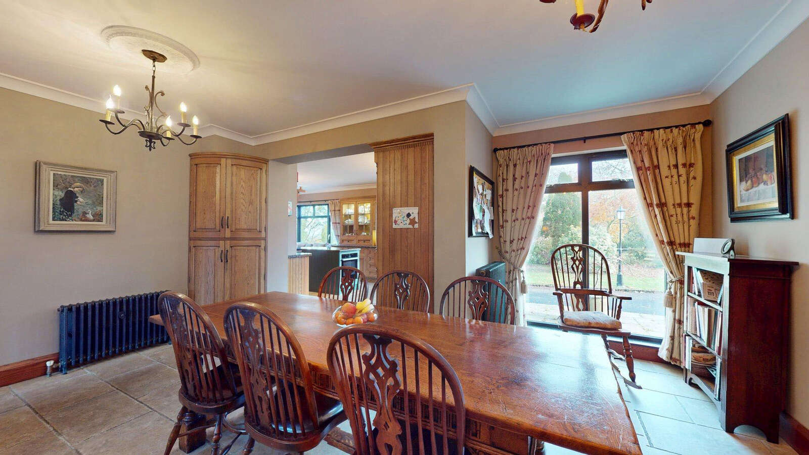 24'6 x 17'6 Feature cast iron fireplace housing multifuel Stove with granite hearth and reclaimed Oak surround with overmantel. Ceiling cornacing with ornate centre piece. Oak wide plank floor. Large picture windows and French doors overlooking beautiful landscaped gardens. Double doors leading to Dining Area.