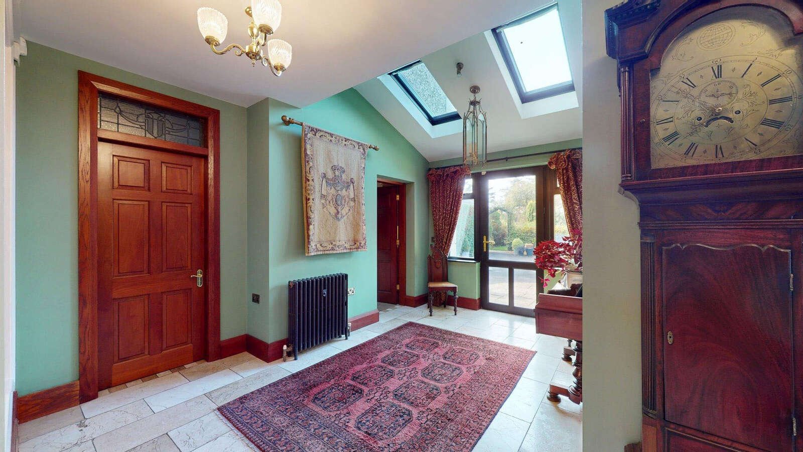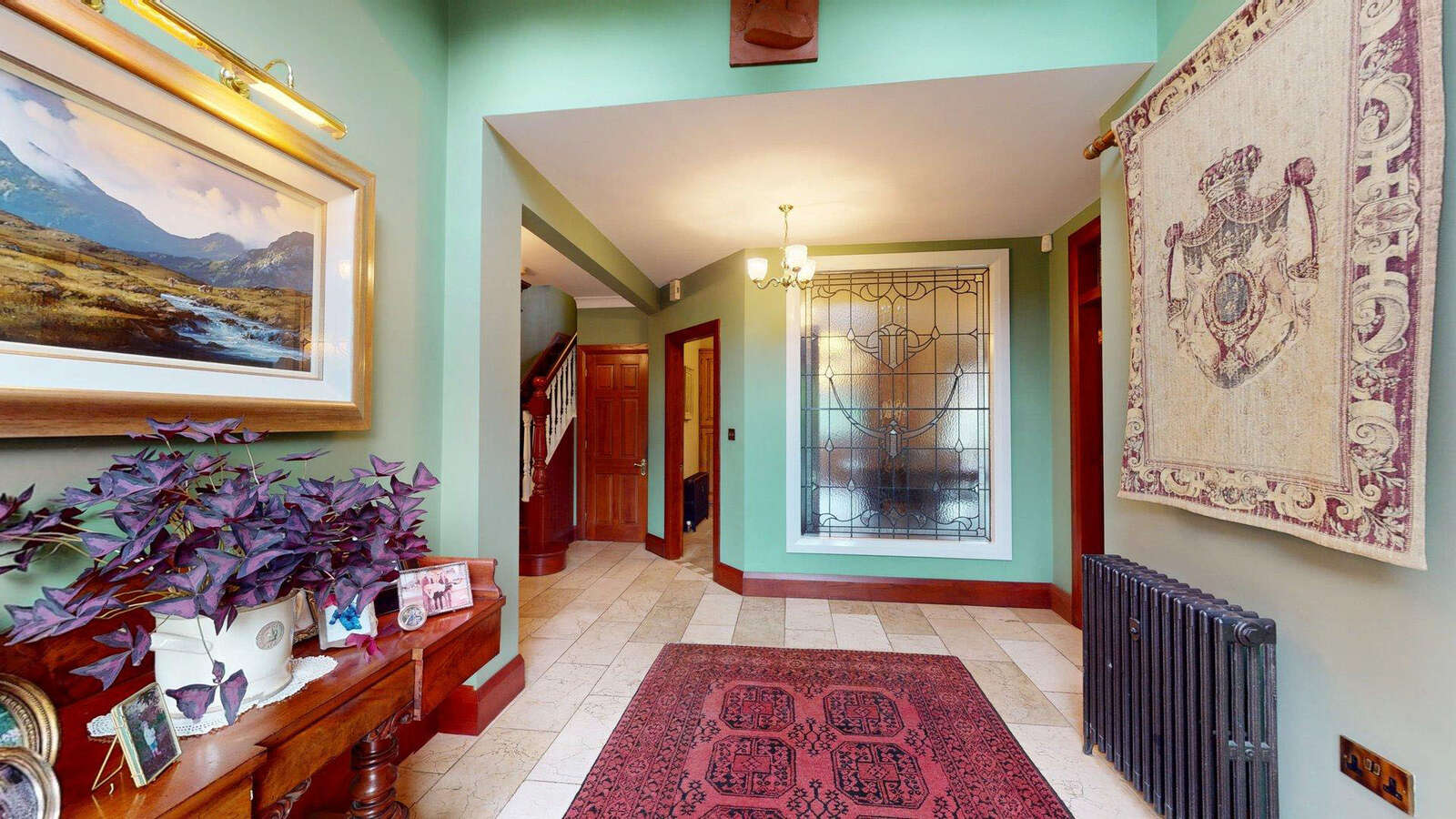 Feature vestibule door and side screen with original stained glass centre lights. Limestone tiled floor. Wall lights. Reclaimed cast iron radiators. Ornate half turned staircase with doorway leading to small Basement Room housing oil fired boiler. Velux double glazed windows and uPVC rear door with double glazed centre light to Rear Porch.