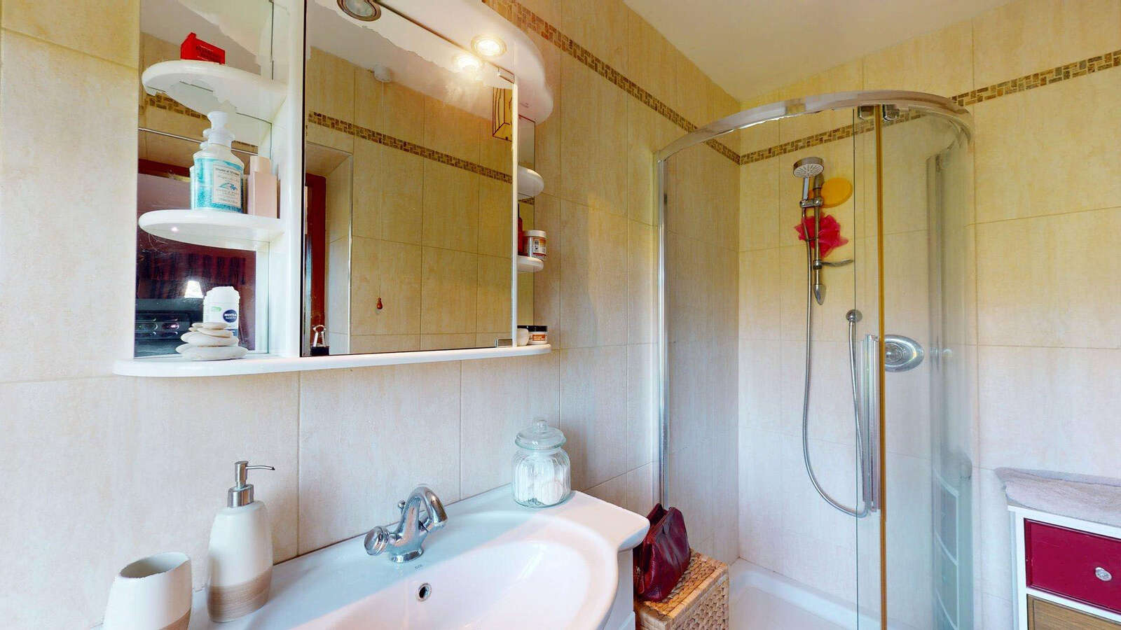 8'8 x 4'8 White 2 piece suite comprising shower unit with power shower. Vanity unit with wash-hand basin and wall cabinet with display shelving and mirror. Good quality tiling to walls and floor.