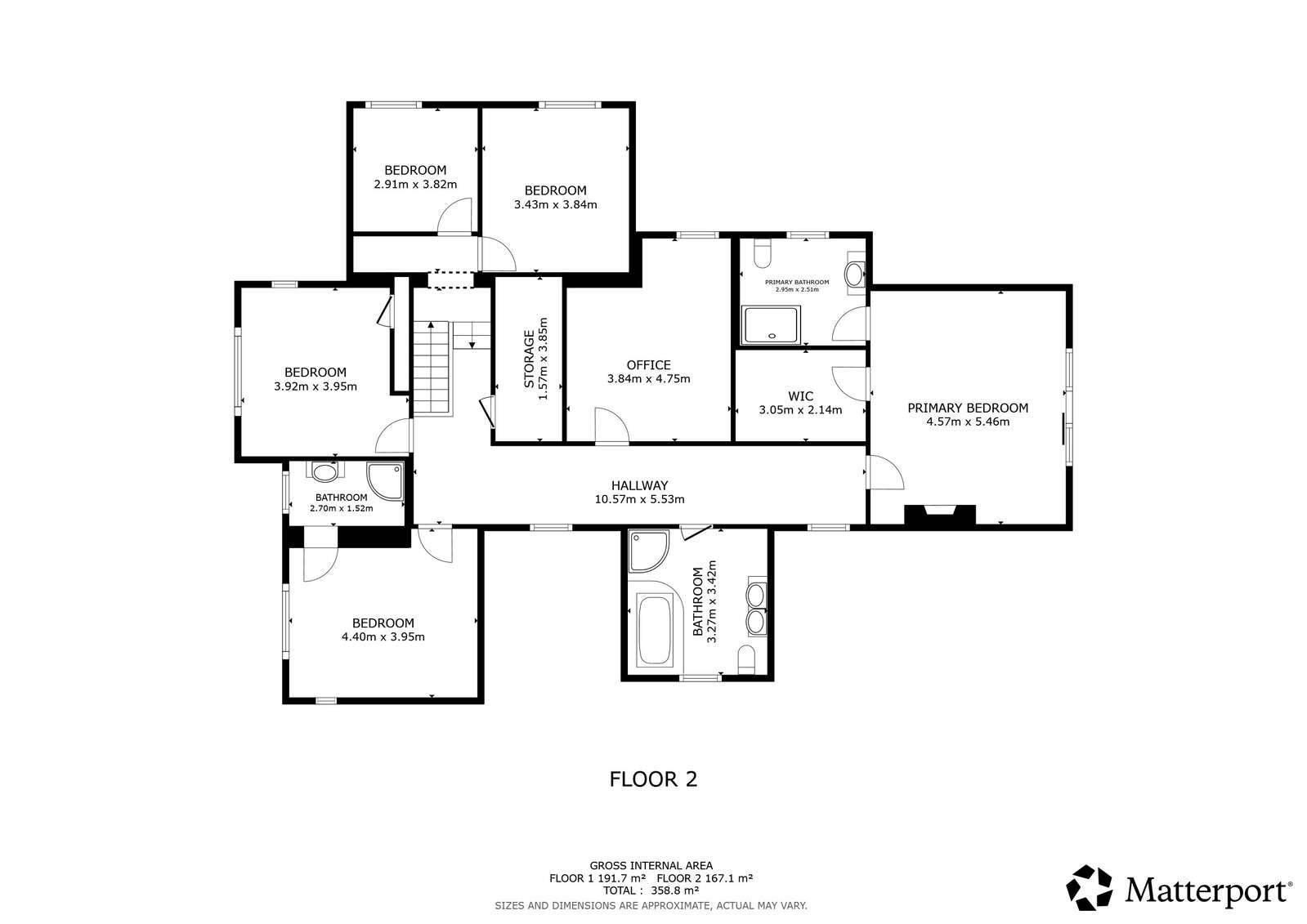 11'6 x 11'0 White 4 piece 'designer' suite comprising large jacuzzi bath. Vanity unit with twin wash-hand basins, chrome towel rail and shelving. Low flush w.c. Large corner shower unit with overhead power shower. Marble tiled walls and floor. Ceiling cornicing with ornate centre piece. Wall lights. Feature inset wall mirror. Chrome heated towel rail.