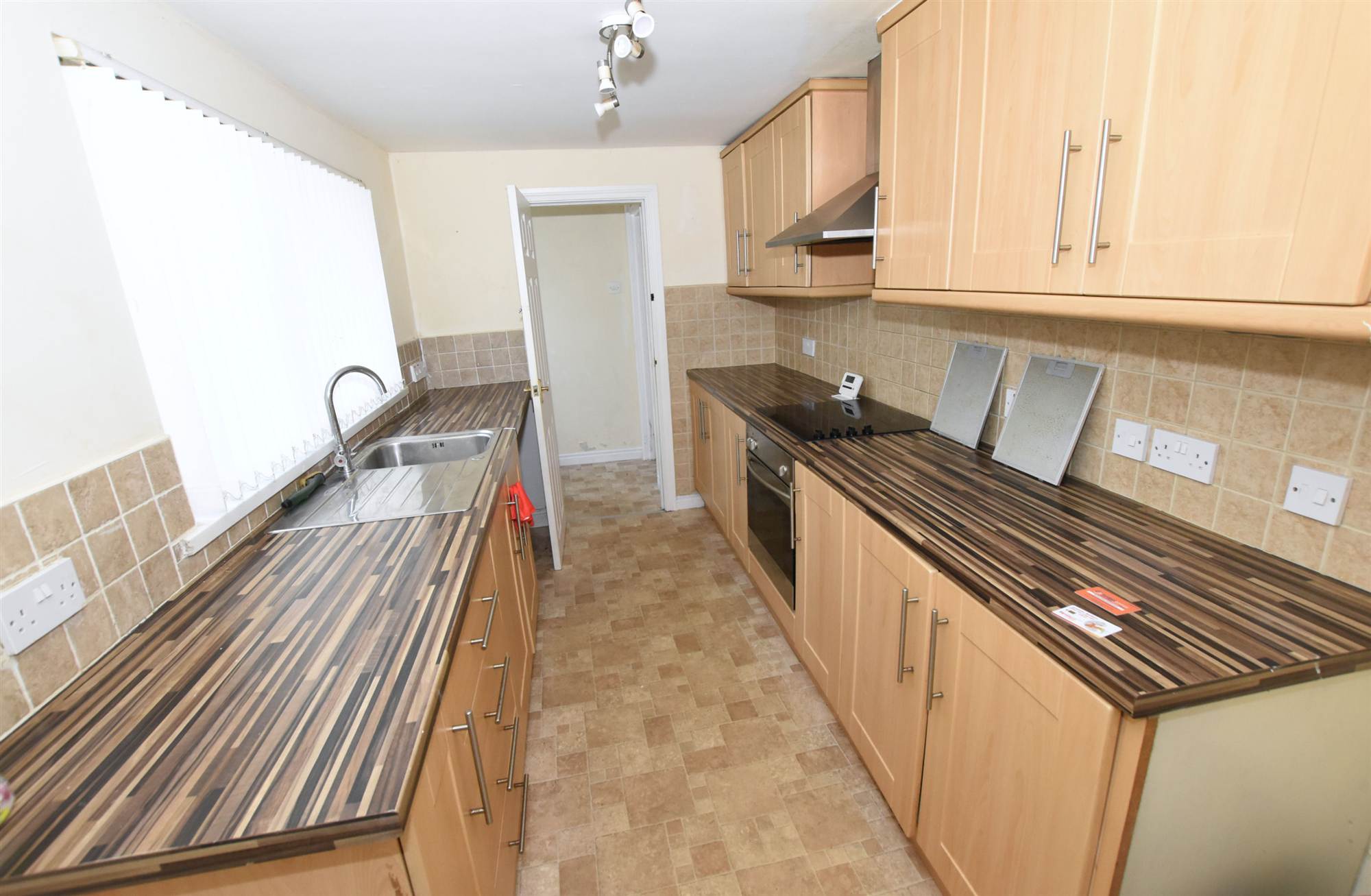 Single drainer stainless steel sink unit with mixer taps, range of high and low level units, formica round edged work surfaces, built-in oven, four ring hob unit, extractor hood, wall tiling, plumbed for washing machine.