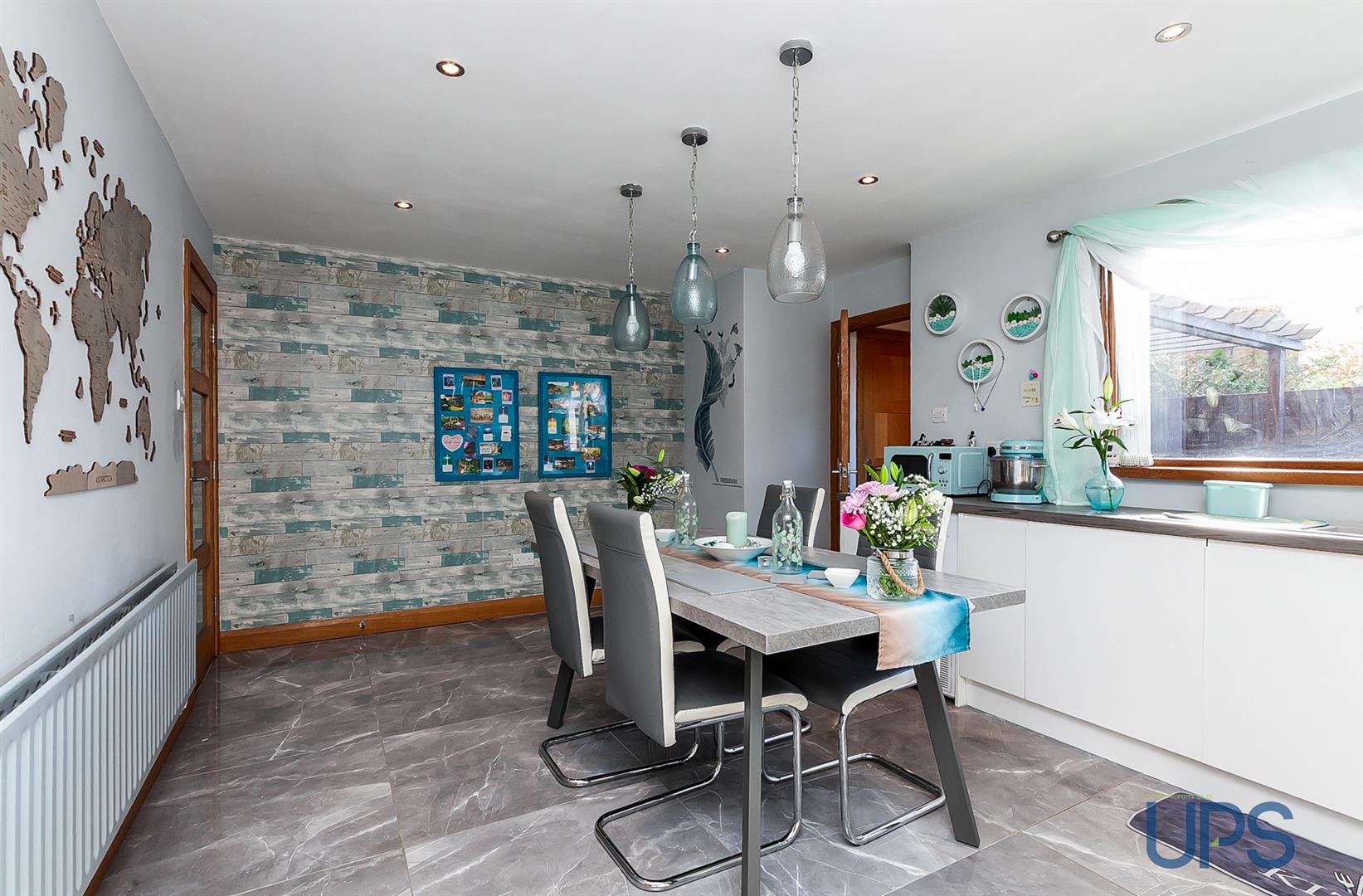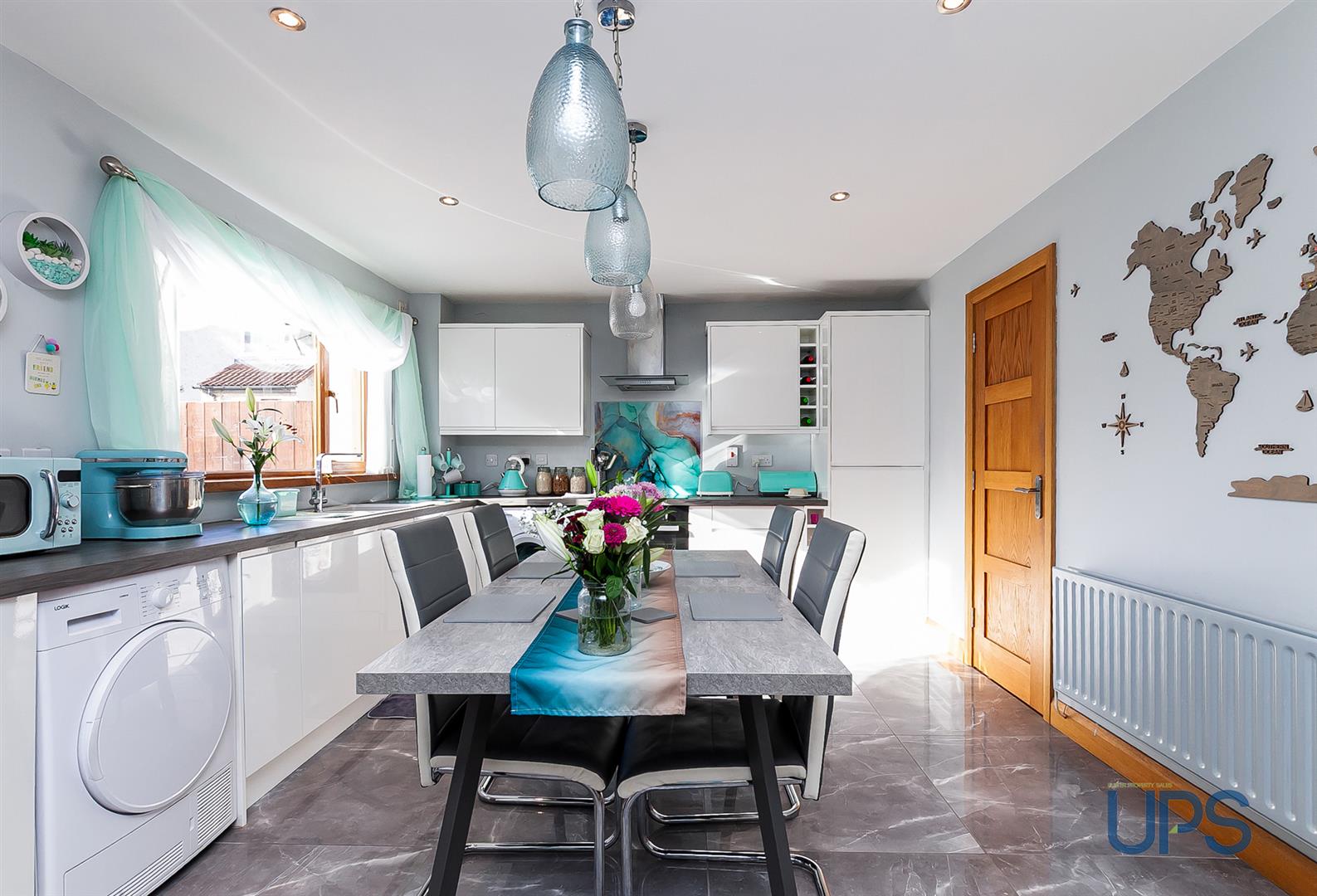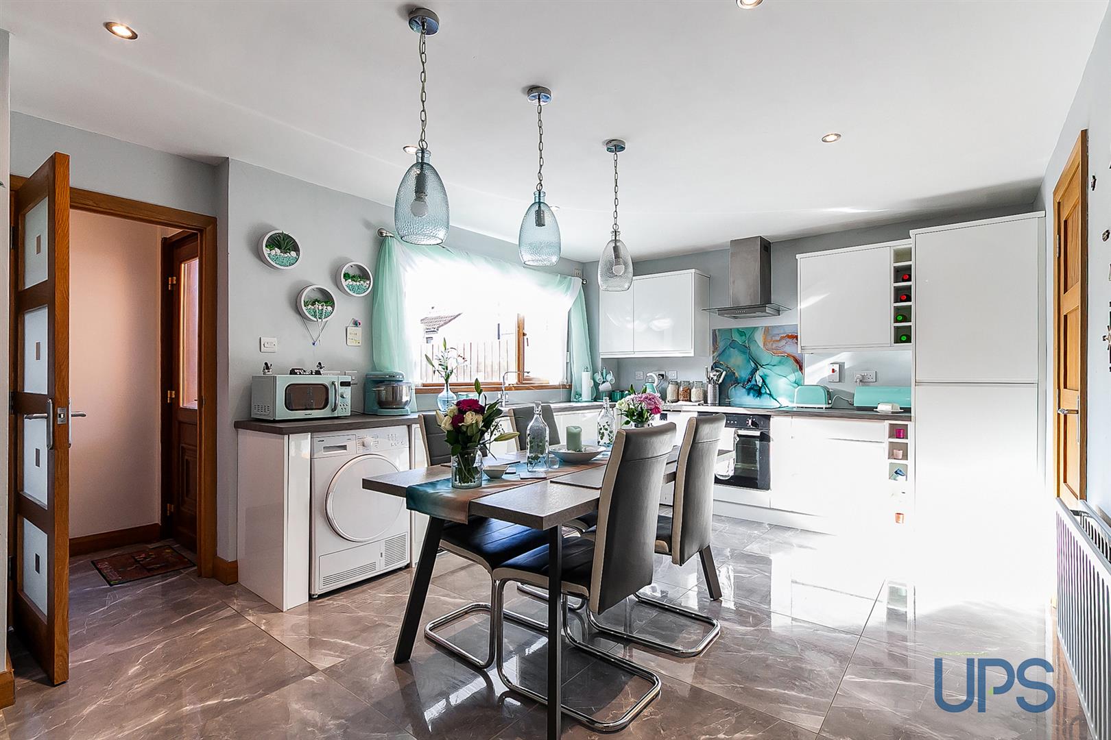 Range of high and low level units, single drainer sink unit, integrated fridge and freezer, integrated dishwasher, spotlights, excellent storage cupboard, beautiful tiled floor, open plan to sizeable dining area.
