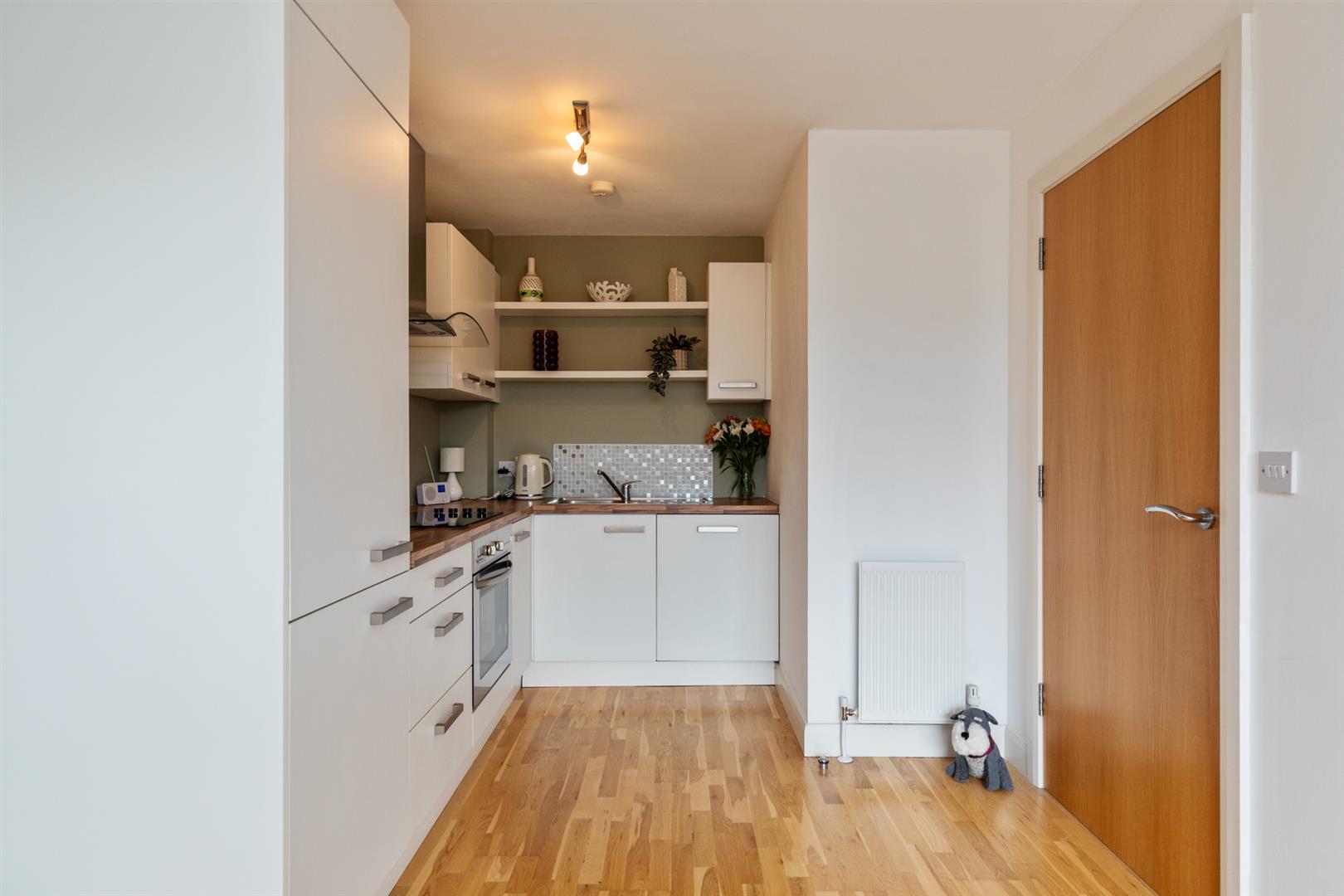 Wooden effect strip floor, utility cupboard, plumbed for washing machine.
